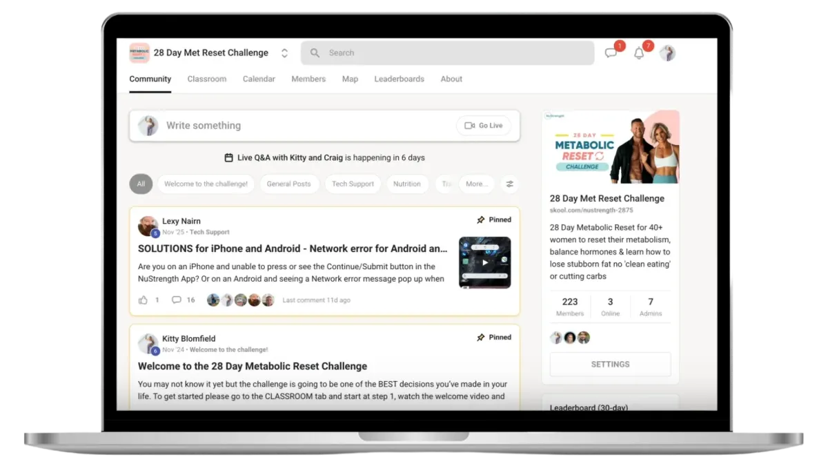You’ll receive instant access to the community platform and course materials, complete with instructions for setting up the NuStrength Tracker App. You’ll have 28 days of access (+ 7 days to get set up) to the NuStrength Tracker app and course materials, plus the direct access to Kitty and Craig to ask questions, get support and coaching throughout the challenge.