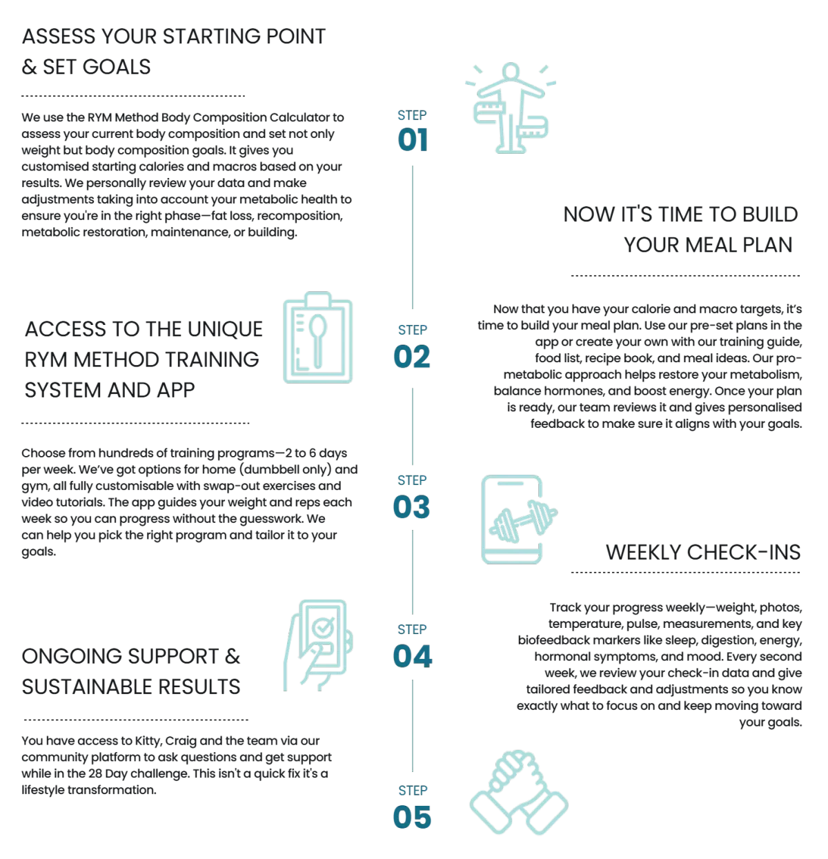 We begin by assessing your body composition and metabolic health using RYM method body composition calculator. From there, you'll get personalised goals body composition goals and we determine the right phase for you, whether it's fat loss, recomposition, maintenance or metabolic restoration. You'll also receive customised calorie and macro targets tailored to your unique goals.